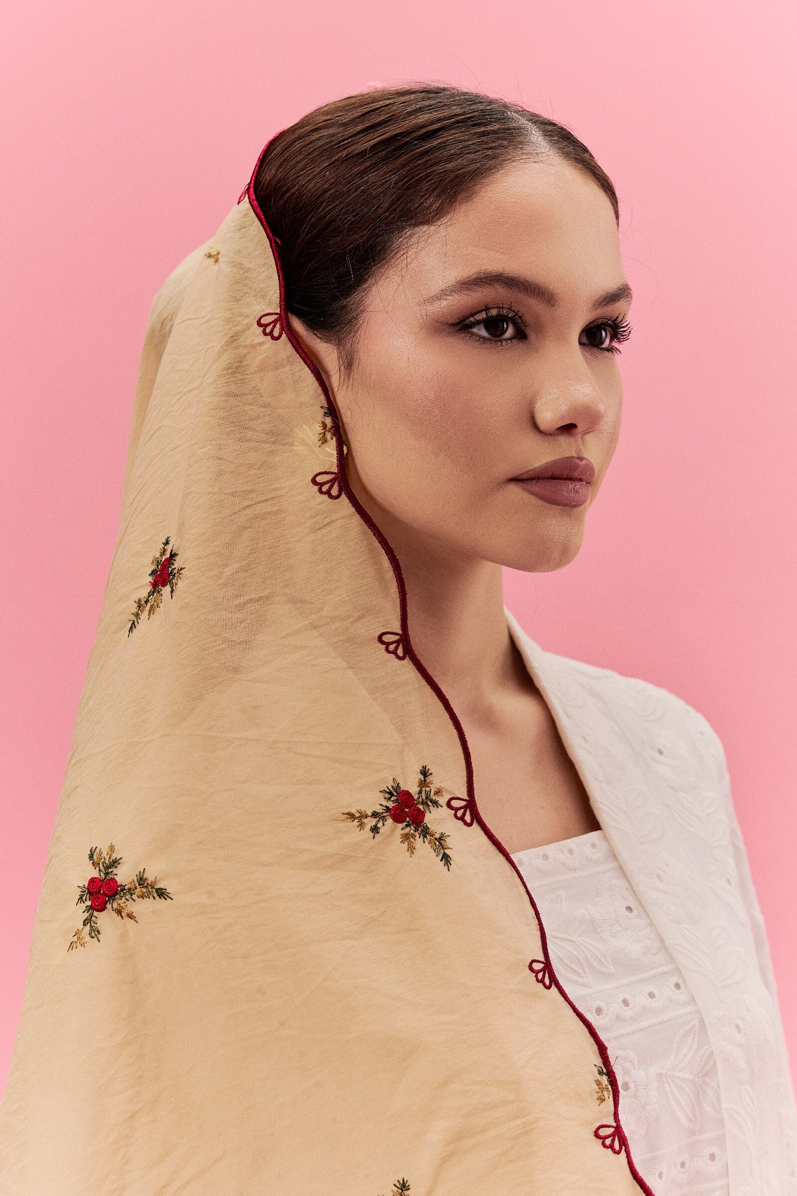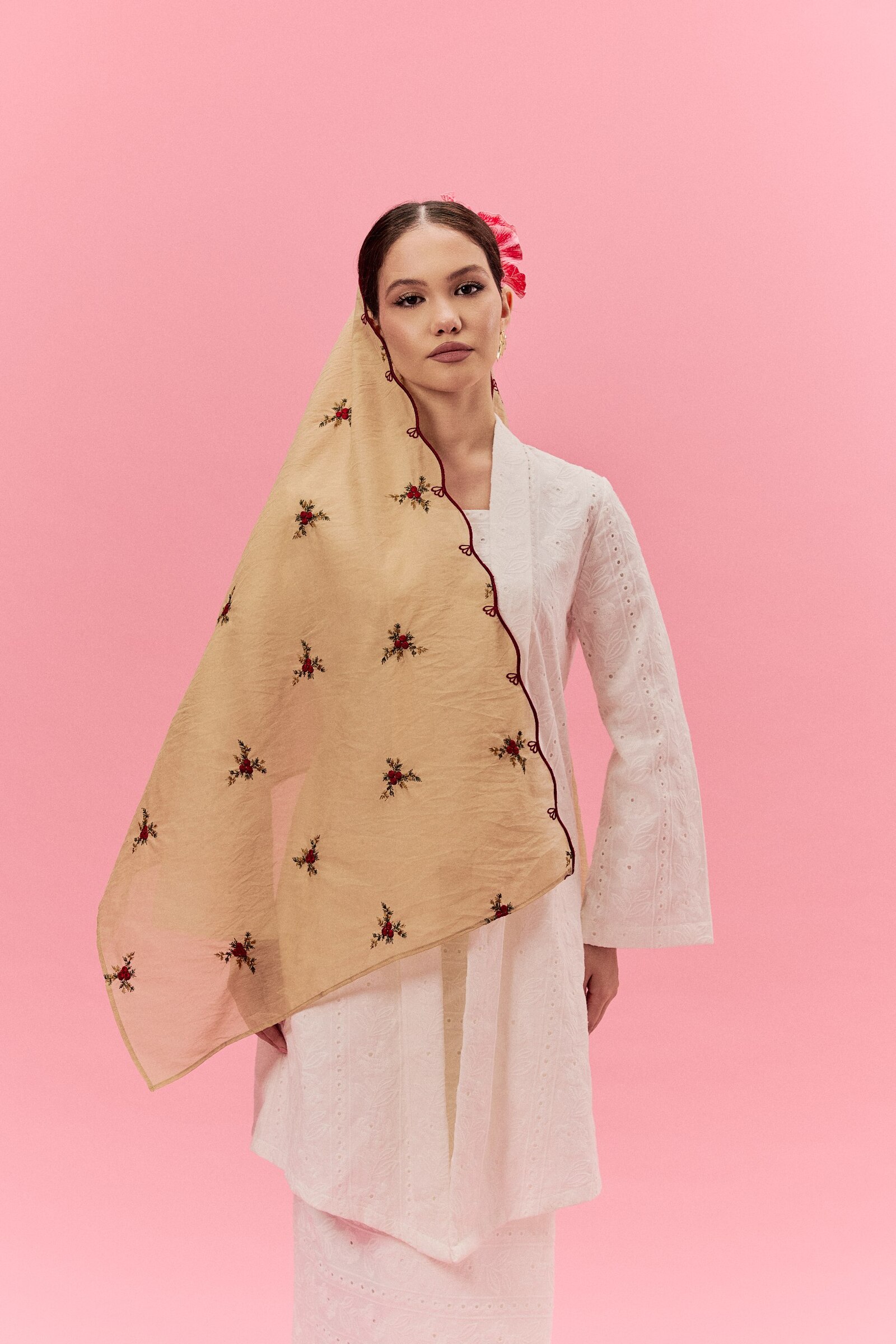 Shawl Mawar Sulam in Golden Brown